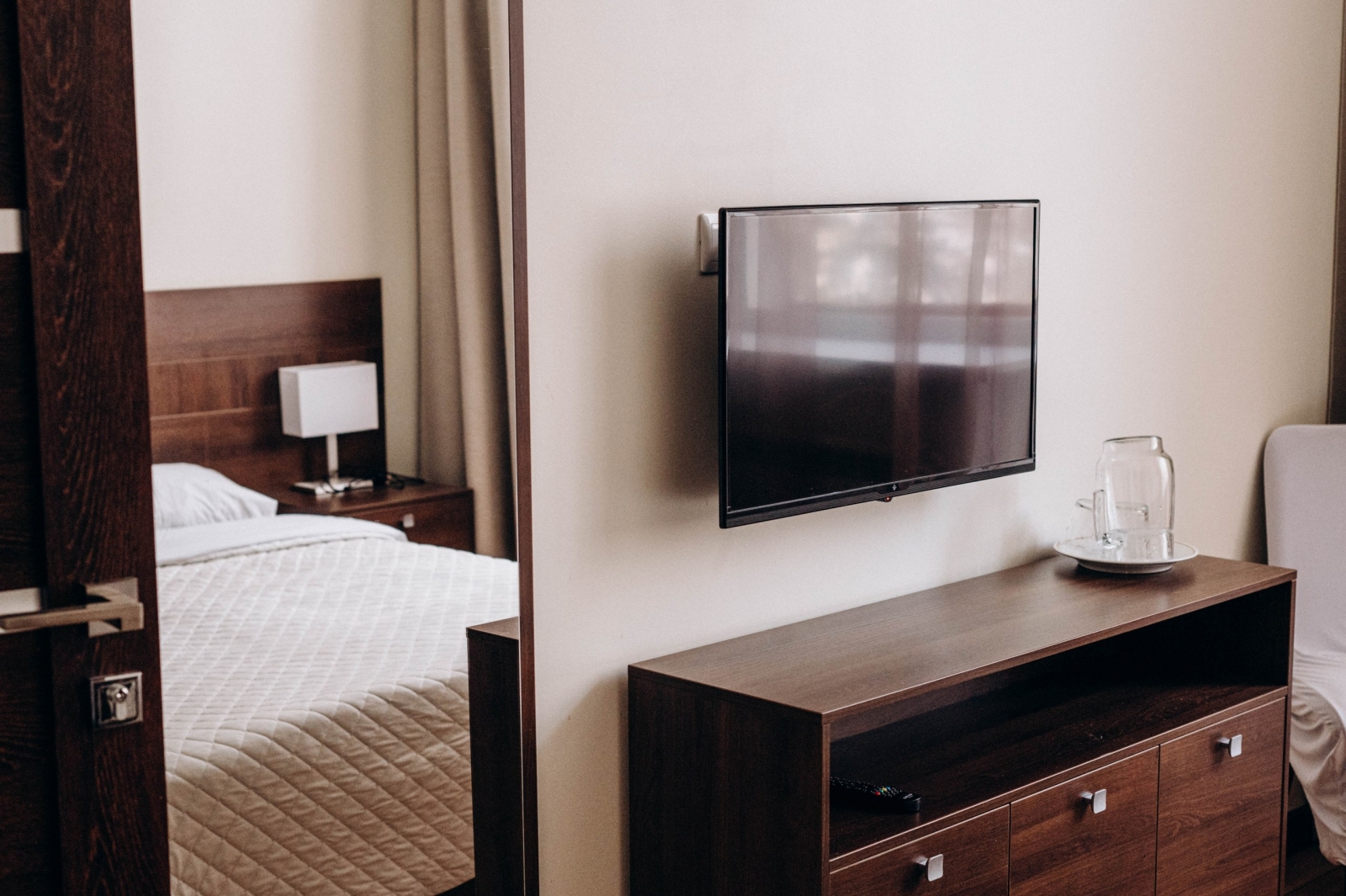 Номер «стандарт улучшенный с двуспальной кроватью», в номере ванная комната, телевизор и комплект полотенец.